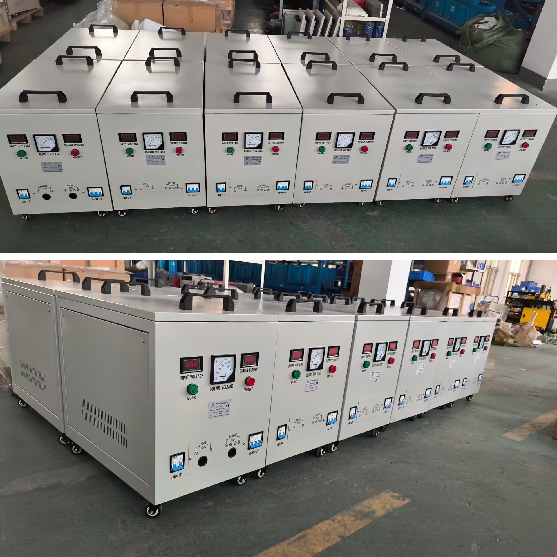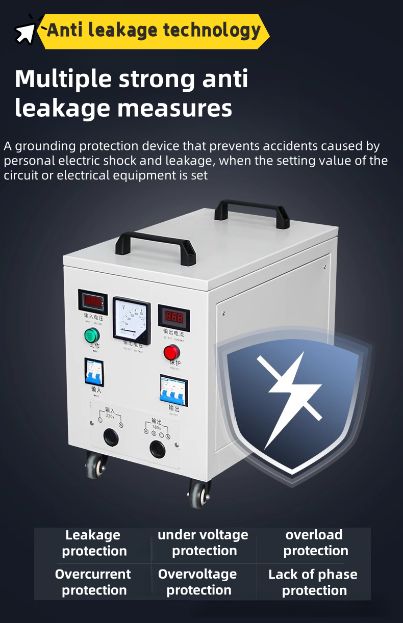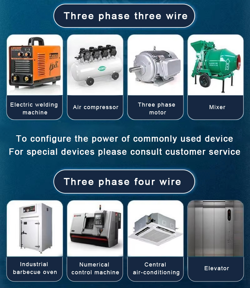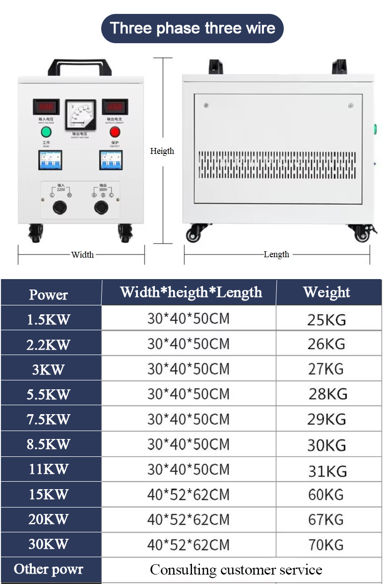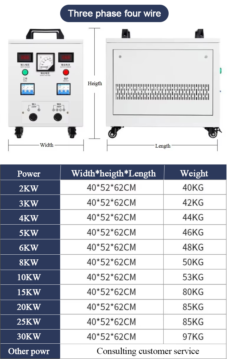 For the sake of electrical safety, it is usually recommended that the capacity of the converter be three times that of the equipment it is equipped with. For example, if your total power setting is 10KW, it is recommended to purchase a 30KVA converter to carry the load.We can customize it according to the voltage you want, such as: